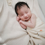 Keep your baby warm and cozy in Mushie’s knitted blanket.