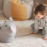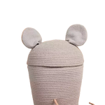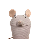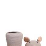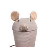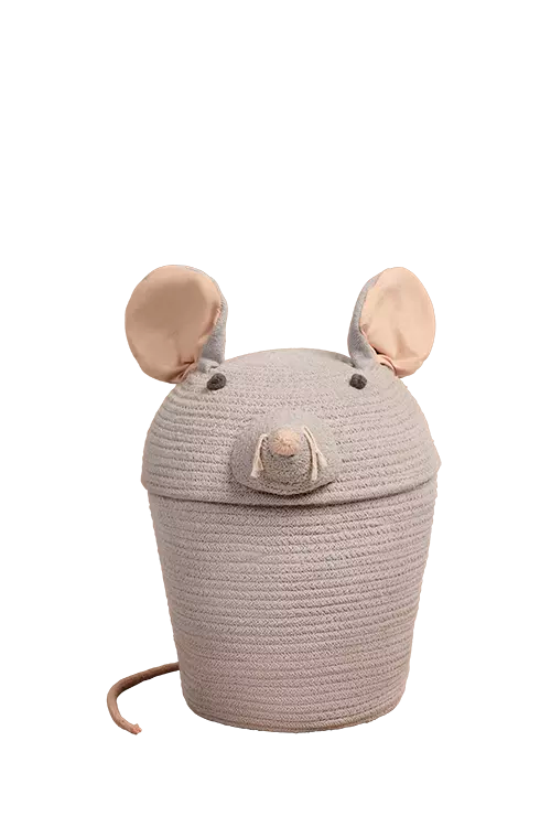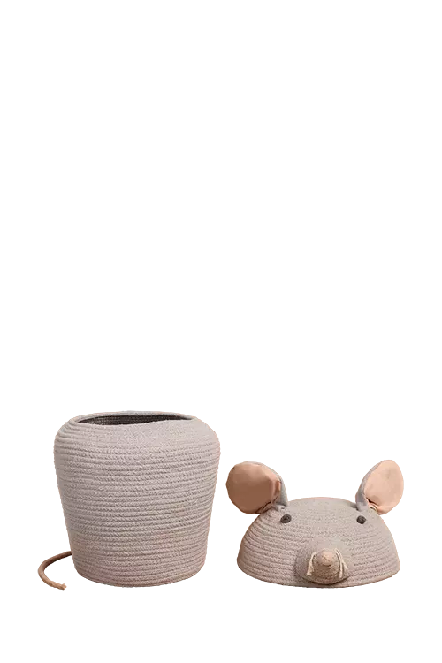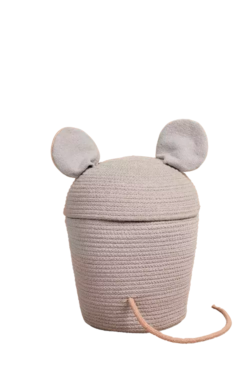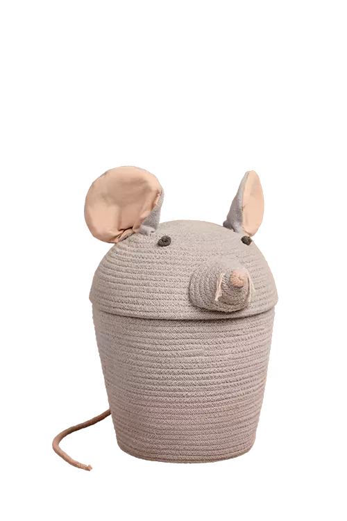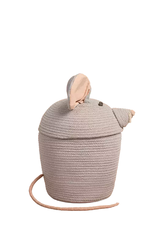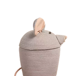 Curious as a rat, Renata the Rat basket is handcrafted using braided cords made of fibers from recycled PET-bottles mixed with our cotton colors. With a slightly cone shaped bottom part in Pearl Grey color and an embroidered pointy nose, the gray canvas ears and the pink long tail gives the final touch to this basket.