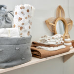 Keep your baby's essentials organized in style with these beautifully finished knitted baskets, available in two sizes. The washable PU inside layer ensures no leaks are a problem. Combine with other items in the collection to create a dream room for your baby and enjoy a clutter-free space. Made with 100% cotton exterior, choose from small (21x16xh16 cm) or medium (26x19xh16 cm) sizes.