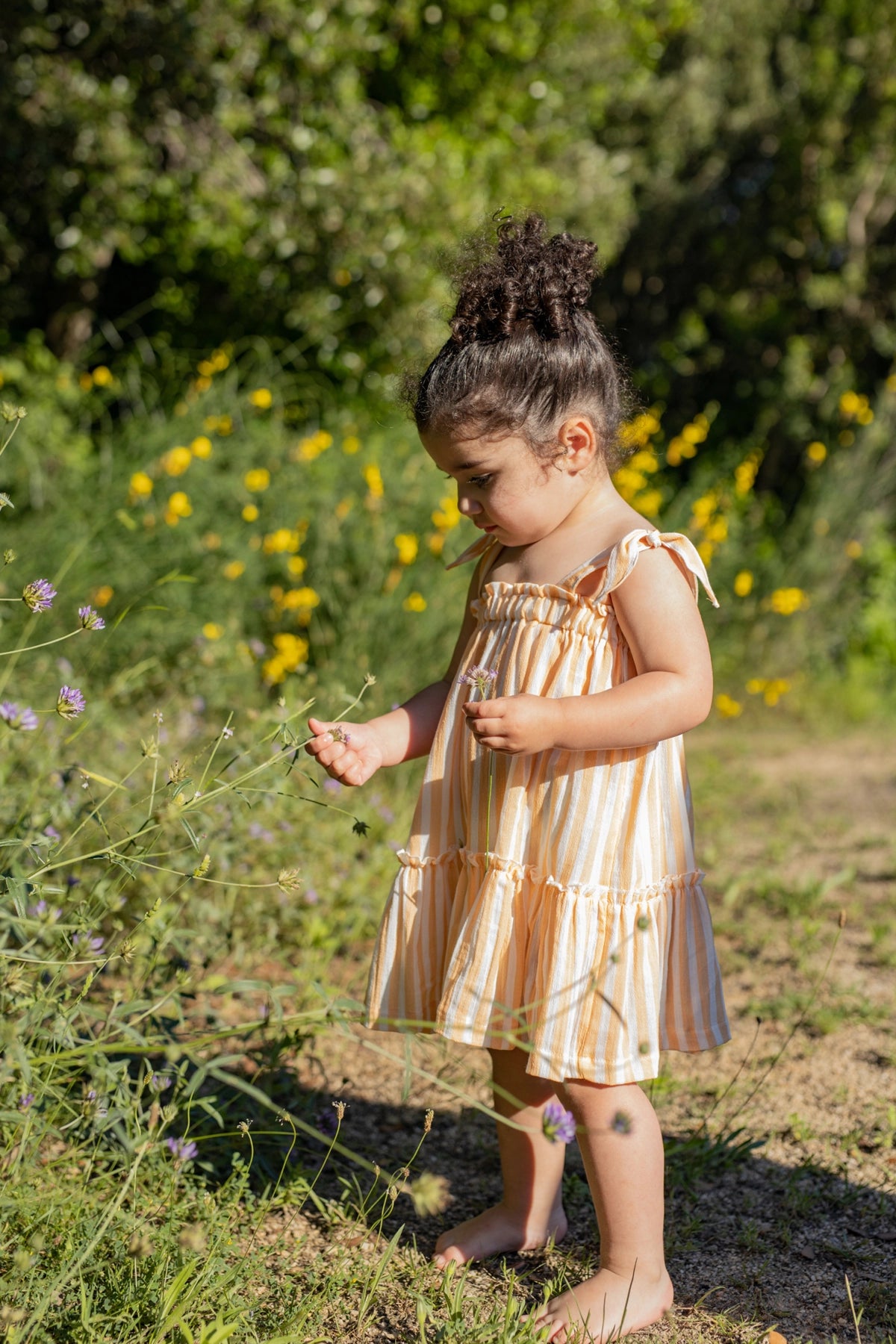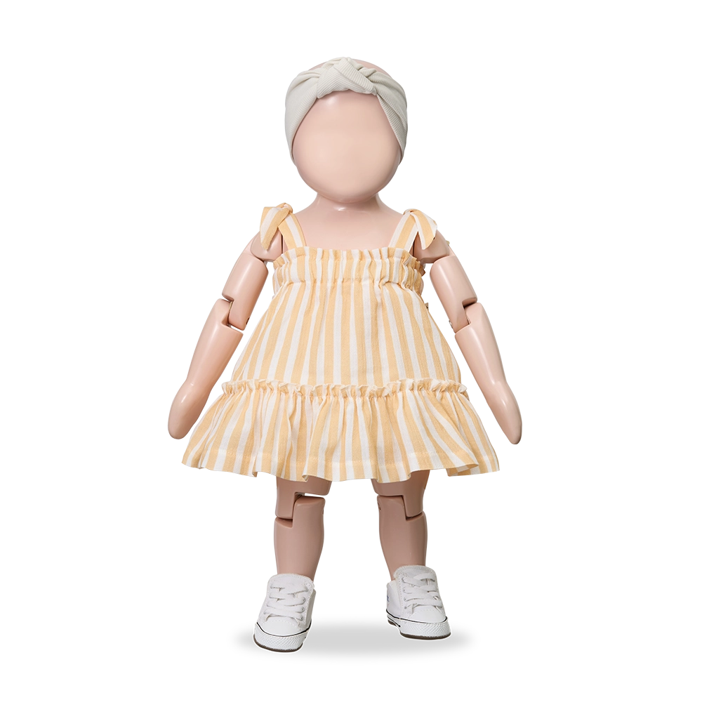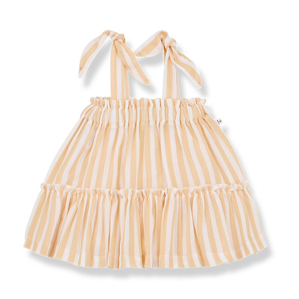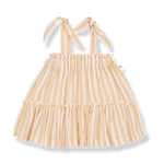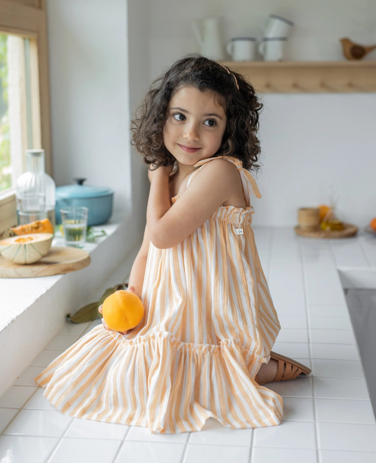 The Araia Dress in Peach by 1+ In The Family is a delightful addition to your child's wardrobe. This beautiful dress is crafted from striped bambula crepe, offering a light and airy feel perfect for warm days. The peach color and charming stripes create a playful but sophisticated look, making it suitable for both casual wear and special occasions. Designed with comfort and style in mind, this dress ensures your little one stays fashionable and comfortable all day long.
