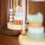 Meet our amazing stacking tower, an absolute must-have for little explorers! The cheetah consists of 4 brightly coloured blocks, this tower provides endless stacking fun. The 6 beads can move along the spiral, which not only provides hours of entertainment, but also stimulates your little one's fine motor skills. The trendy colours of lavender, caramel, ivory and ash green not only make this stacking tower super cute. You also make a responsible choice with FSC 100% certified wood. Let’s play!