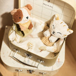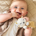 This adorable wrist rattle is the perfect toy for your baby. The boucle kitty has sweet yellow stripes and makes a cheerful sound with every movement. The wristband makes it easy to fasten to your baby's wrist. Your little one's new favorite buddy always close by!