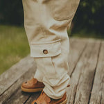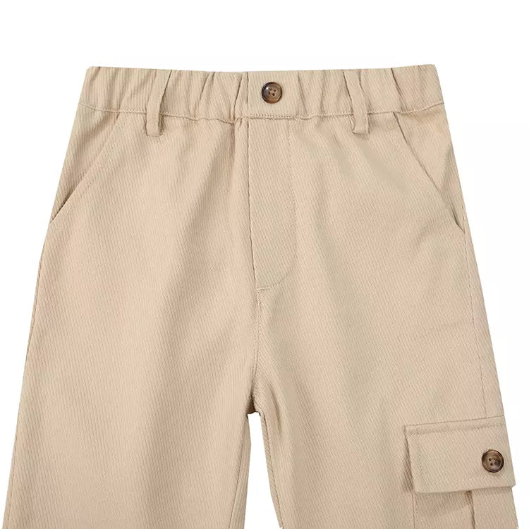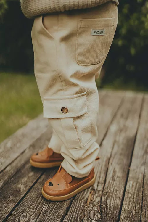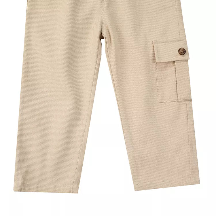 Pretty in corduroy! Your little gentleman will love the Theoule Trousers for comfort and roomy pockets for all their tiny treasures. Made from 100% cotton and with an elasticated waistband, this pull-up pair has a decorative front fastening and side, back and cargo-style front pockets.