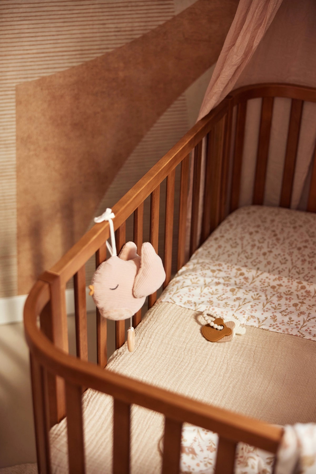 Shop the cutest musical hanger at Jollein now! This sweet little bird from the Lovely Birds theme in the colour Wild Rose plays the beautiful tune ‘Lullaby’ by Schubert when your little one pulls the cord. Made of soft ribbed fabric and finished with cheerful, colourful tags, this Lovely Bird is not only fun to listen to, but also to play with! Perfect to hang by the playpen or cradle for endless entertainment!