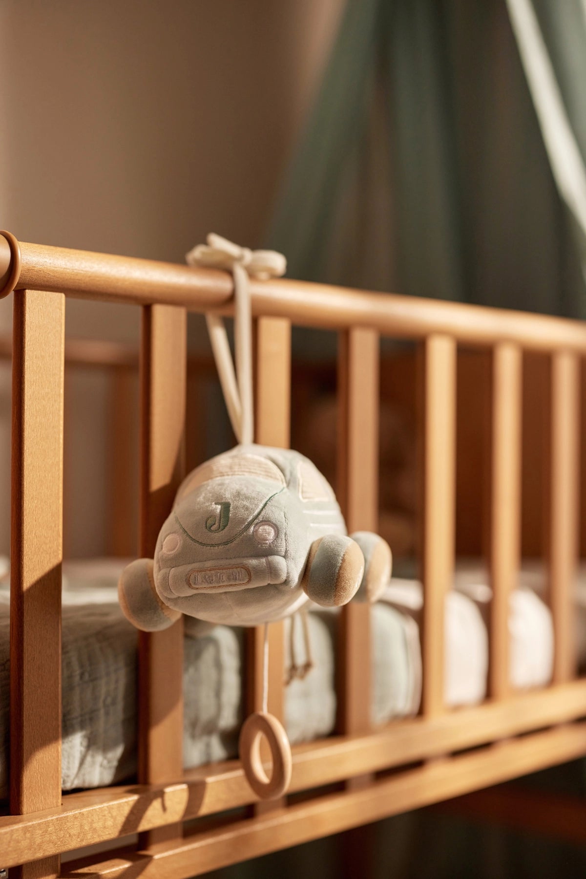 Create a serene bedtime routine with the enchanting Musical Hanger from the 'On The Go' collection! Designed in the shape of a soft car, this charming piece features a soothing Sea Green color, biscuit-colored wheels, and ribbed fabric windows for added detail. By pulling the cord, your little one will be gently rocked to sleep with the delicate melody of a lullaby. With its calming design and musical touch, this hanger is the perfect companion for peaceful dreams and cozy moments.