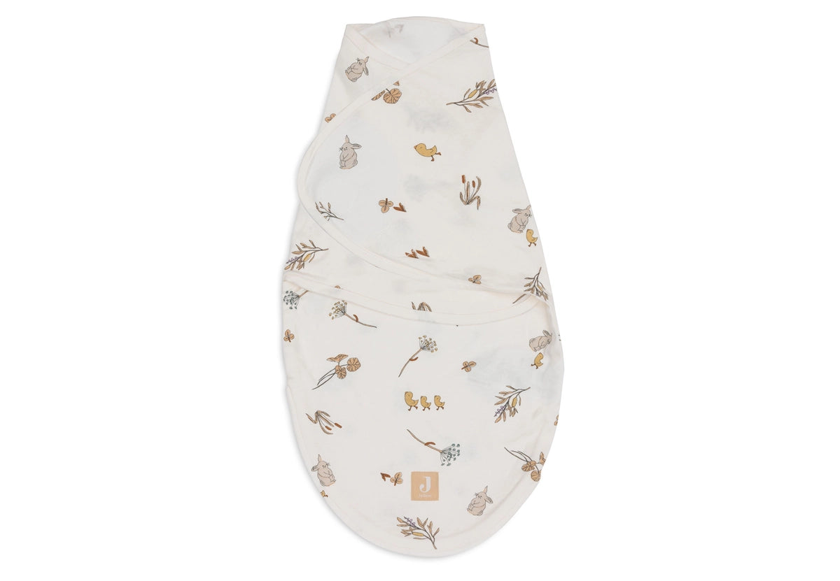 This nice wrapper sleeping bag ensures that you can properly swaddle your little baby. It is suitable for babies between 0-3 months. This wrapper sleeping bag has a nice Farm print. It is a nice solution if you have a restless baby. The swaddle bag is easy to put on with the sturdy yet soft Velcro. There is a practical zipper at the bottom of the wrapper, useful for changing a diaper. You unzip the bottom and the rest of the wrapper can remain on the body. This cute riverside print features bunnies, ducks and all kinds of riverside plants. Very cute and easy to combine thanks to the light ivory colour!