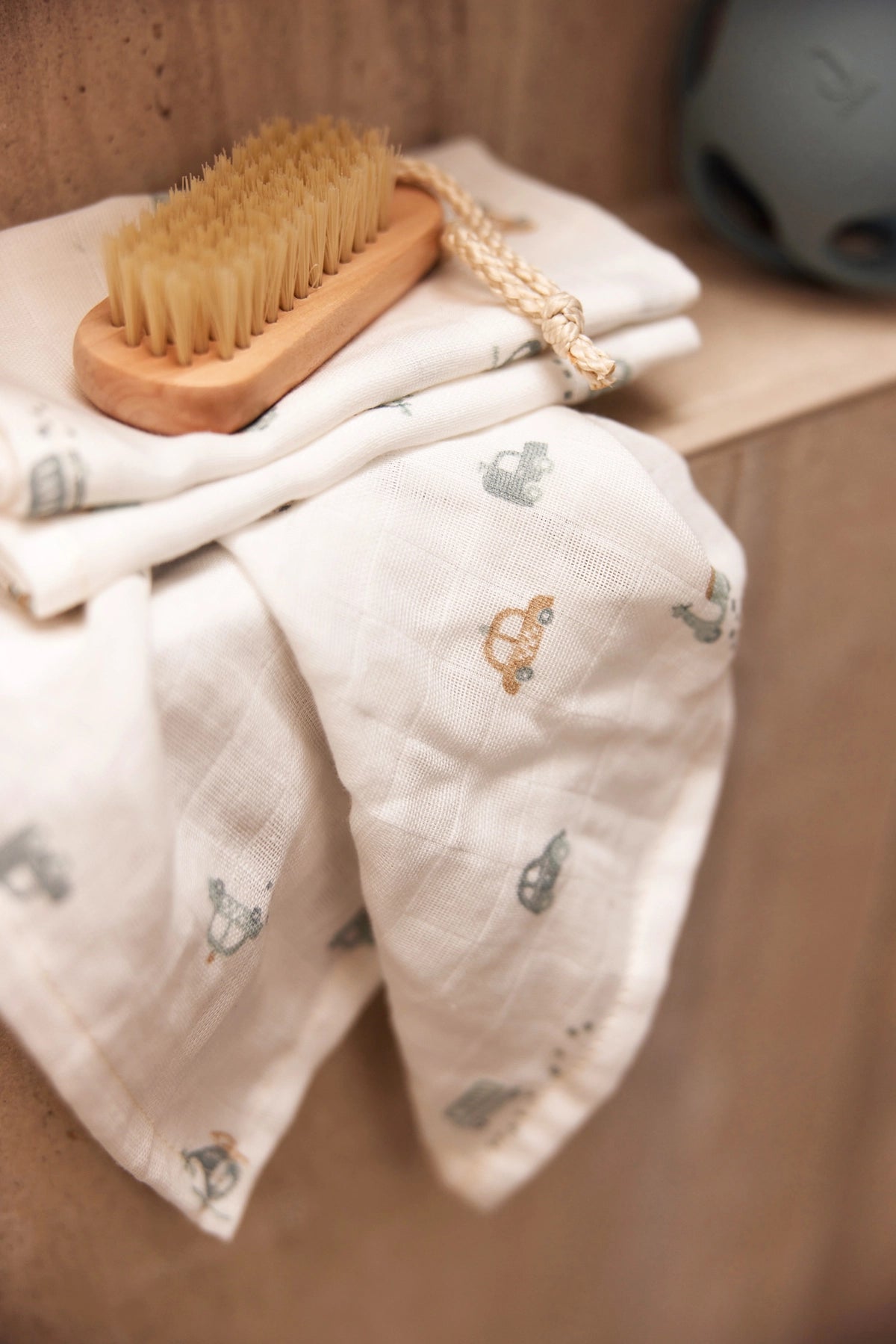 Muslin cloths are indispensable for every parent! Whether you use them as towels, burb cloths, underpads or blankets On The Go - the possibilities are endless. These cute cloths, in an On The Go theme, are wonderfully soft and perfect for sensitive baby skin. This 2 pack has a fun all-over print full of cars, scooters and helicopters in Sea Green and Biscuit colours!
