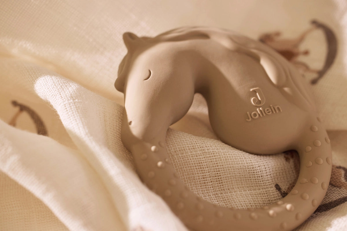 Discover the great rubber toys for little ones: sturdy, soft and safe. It offers a pleasant chewing experience and is easy to keep clean. Go for rubber and give your little one the opportunity to explore safely! This teething ring in the shape of a horse with the colour Biscuit helps with the development of the jaw and can reduce the pain of teething, while also providing entertainment.