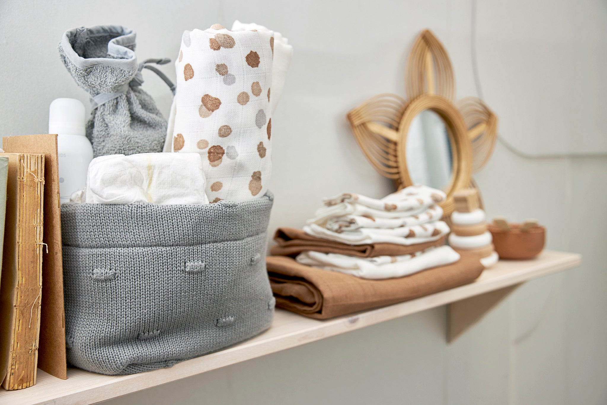 Keep your baby's essentials organized in style with these beautifully finished knitted baskets, available in two sizes. The washable PU inside layer ensures no leaks are a problem. Combine with other items in the collection to create a dream room for your baby and enjoy a clutter-free space. Made with 100% cotton exterior, choose from small (21x16xh16 cm) or medium (26x19xh16 cm) sizes.