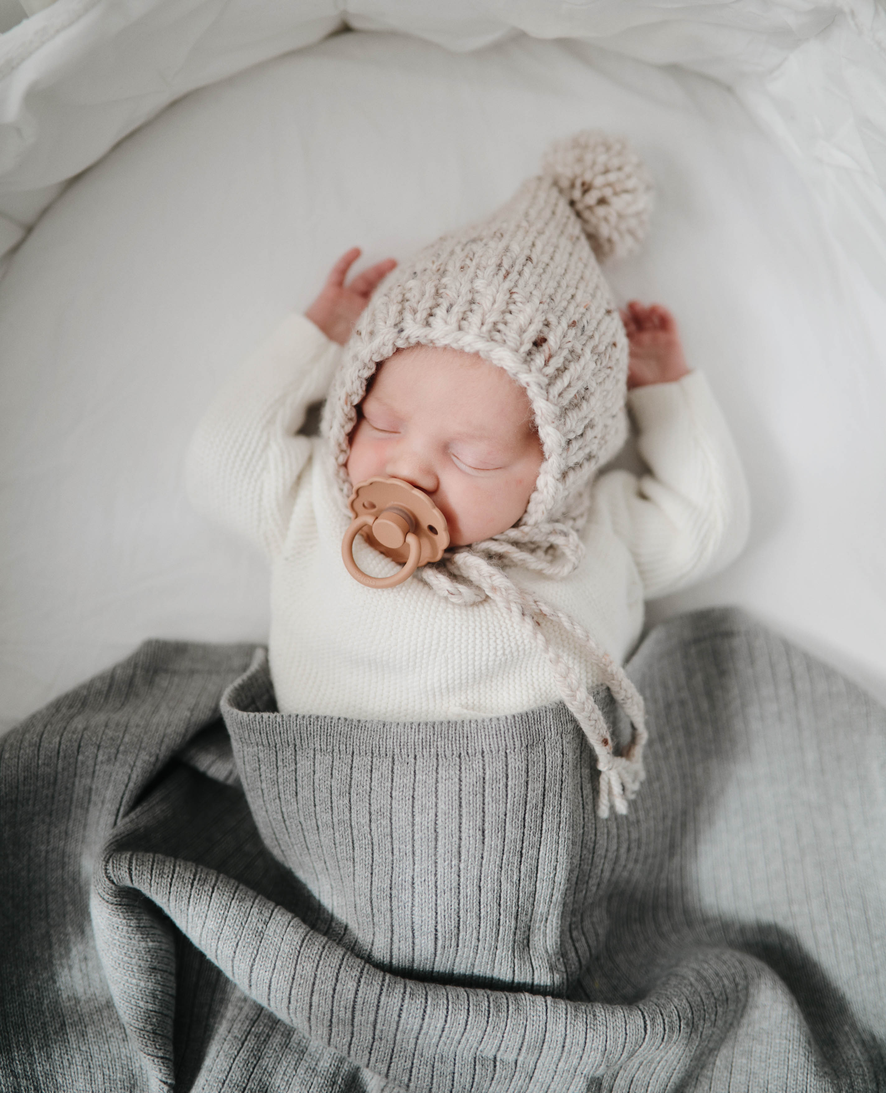 Keep your baby warm and cozy in Mushie’s knitted blanket.