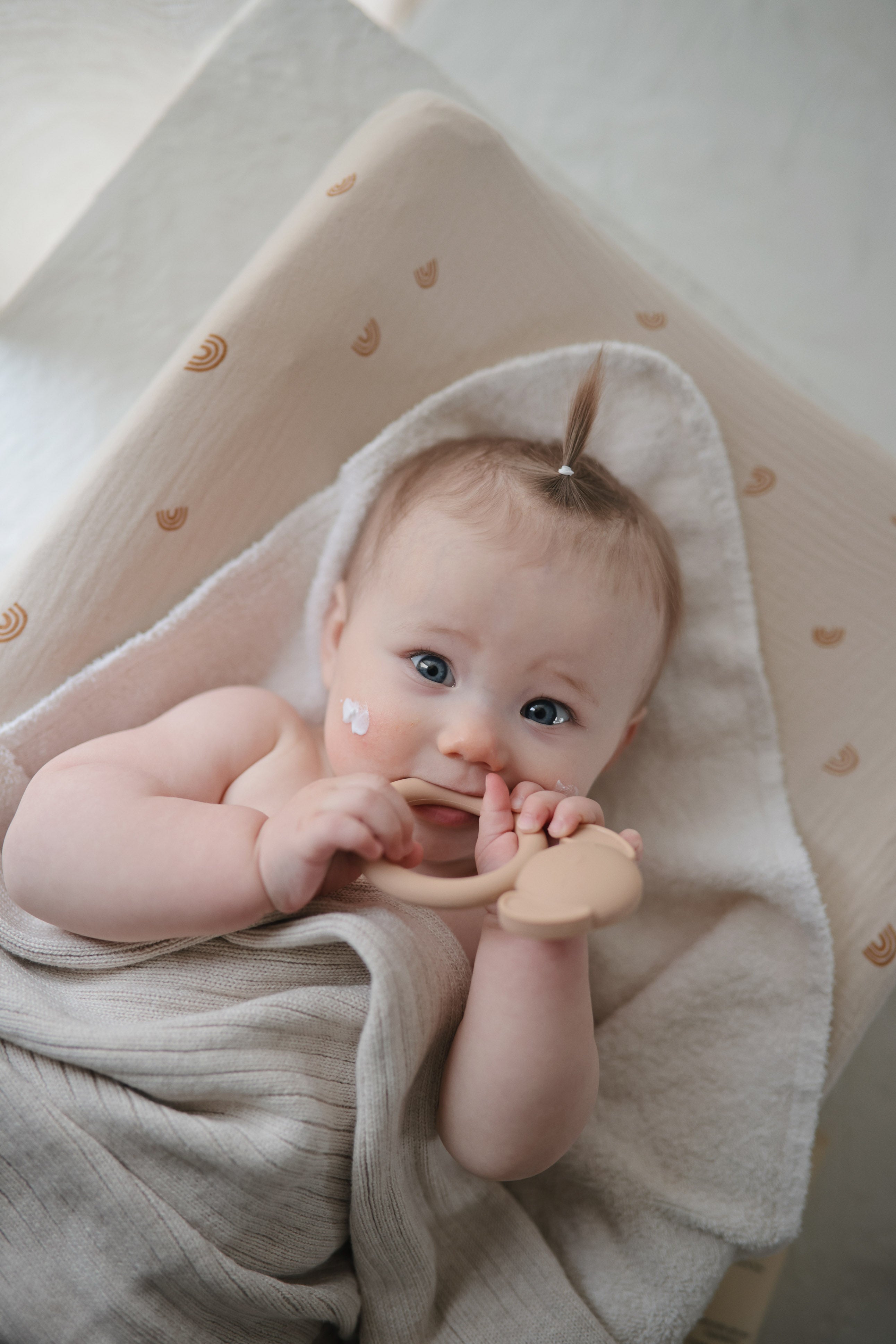 With a teether you can help soothe your baby’s irritated gums when teeth are starting to come out. The Mushie Teether Dog is made from food-grade silicone, and is designed to be easily grasped by tiny baby hands.