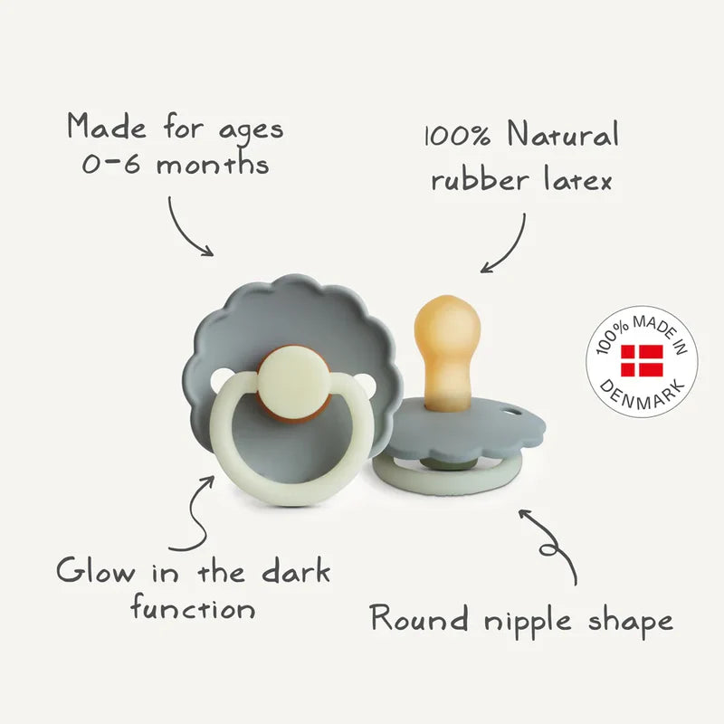 FRIGG Daisy pacifiers are available in two sizes: