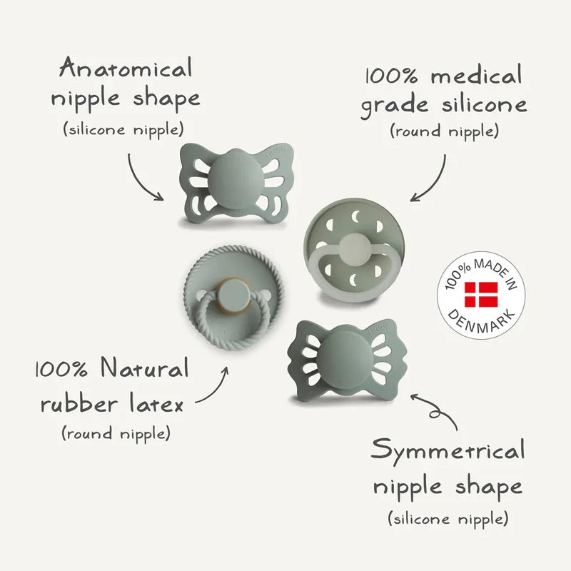 This curated 4-pack brings together FRIGG’s most beloved designs in gentle blush tones and natural sage. Created for newborn comfort and parent peace of mind, every pacifier in this set is made with thoughtful detail and Danish craftsmanship.