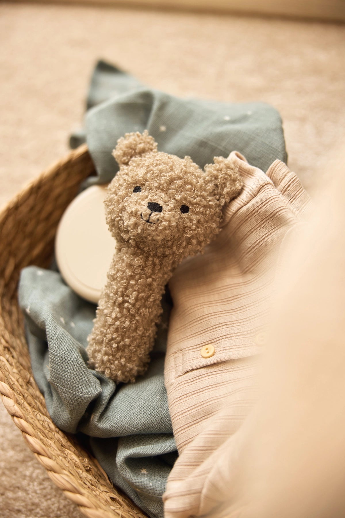This teddy bear rattle is perfect for your little one to practice their grabbing skills. The soft bouclé fabric makes it easy to hold onto and safe to play with. The rattle contains a gentle bell that rings when your baby moves it, keeping them engaged and entertained. After playtime, your baby can also snuggle up and cuddle with this adorable fabric baby rattle. This teddy bear rattle is a must-have for any baby's toy collection!